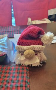 You will do fringing for the beard and top of the hat. Use the number of strands and lengths suggested in the pattern. Positioning is also given in the pattern.