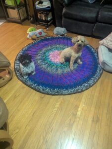 I had a large quantity of Phentex dropped in my lap. It is the same stuff my mother would make us slippers out of when we were kids and I always found it rough. I truly hate waste so I pulled it out of my stash a few weeks back and realized I had enough to make a rug and the colours made me smile. This rug makes me think of a geode and Milly and Nina love it. I don't mind the feel of it when I walk on it, but I wouldn't want to wear it on my body. I am glad I decided to do this.